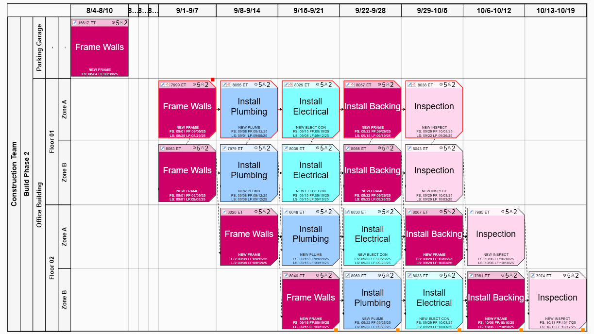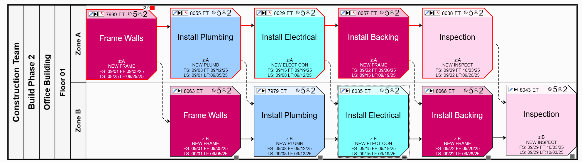 The layout below shows tasks tagged with the same Building tag, the same Floor tag (floor 1) and two different Zone tages: Zone A and Zone B.