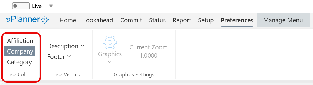 The default task color is the color of the company or the color of the discipline of the user responsible for the task. Users can adjust how vPlanner applies task colors from the Preferences menu. The Affiliation option gives priority to the Discipline color over the Company color if the user is affiliated with a discipline. The Category color will override task colors to show the color of the Category attribute assigned to the task.